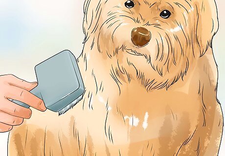 Brush his fur. Your Labradoodle’s curly fur coat will need to be brushed weekly to keep out the mats. His fur may be anywhere from wavy to tightly curly, so the amount of mats that may develop in it will vary depending on the texture. If his hair is really curly, you may need to brush it twice a week. While you are brushing him, look for fleas, ticks, lumps, scraps, scabs, bumps, or any other skin abnormalities. When he is going from puppy to adult dog, you will need to brush out his fur more often. His softer puppy hair will start to tangle with the adult curly hair and may cause problems if left alone too long.