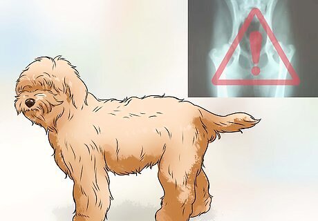 Watch for breed specific conditions. There are a few conditions that your Labradoodle will be more susceptible to. He won’t be as susceptible to the conditions that affect purebred Poodles and Labradors, but there are some common to the mixture breed. These health issues include: Hip dysplasia, which affects the hip joints and may lead to arthritis. Elbow dysplasia, which is caused by abnormal development of the elbow and may lead to lameness and arthritis Progressive retinal atrophy, which is where the retina in the eye degenerates over time von Willebrand’s disease, which is a blood clotting disease that can lead to uncontrollable blood loss from even small injuries.