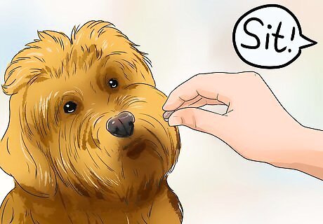 Train your dog. Your Labradoodle is a wonderful breed for training. To get the best results, start training him early, at least within the first six months that you have him. Start by teaching him basic commands with a reward-based system. Start by using treats to gain his attention, show him how to do a command such as ‘sit’, then give him a treat. Continue to do this until he can do the trick on your command on his own. This will work with most basic commands, with additional commands such as ‘come,’ ‘stay,’ or ‘roll over.’ You can start as early as eight weeks, but his attention span may be short. Be patient with him and he will eventually learn.
