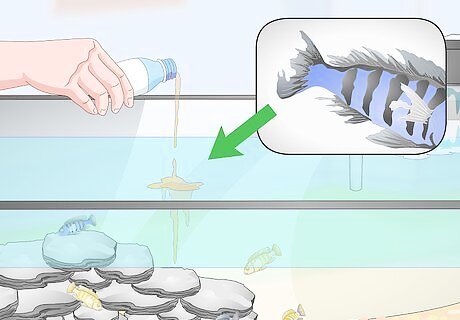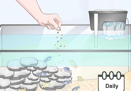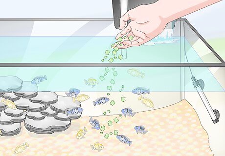 Give the fish food daily. Give these fish their herbivore diet once a day. However, pick 1 day a week to not feed them, as that will give them a chance to clean up algae in the tank. Aim to feed the amount of food your fish can eat in about 5 minutes. If you prefer, you can offer 2 smaller meals twice a day, particularly for young cichlids.