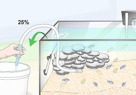 Change 25% of the water at least every other week. This process will help keep the water clean and nitrite- and ammonia-free for your fish. You will need to siphon off the old water (avoiding any fish), and then replace it with pre-conditioned new water. Prepare the new water just as you did when filling the tank for the first time. Turn off the heater while changing the water, as you don't want it exposed to air; it can crack. Check the water balance of the tank often. Measure pH levels, ammonia levels, and nitrite levels at least once a month. You may need to adjust the levels of the tank by partially changing less of the water more often.