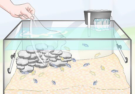 Pick a tank that's a minimum of 20 to 30 gallons (76 to 114 L). These fish are medium-size, and they are used to a lot of space in their freshwater home, the Lake Malawi in East Africa. Therefore, you want to start with a tank that's at least 3 feet (0.91 m) long. Look for one that's low and wide rather than tall, as these fish tend to stick to the bottom of the tank.