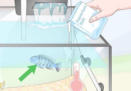 Treat white spots (ich) with extra heat and extra aquarium salt. Increase the temperature of the tank a few degrees, though don't go over 82 °F (28 °C), which will cause the ich eggs to hatch. Then add an extra 1 tablespoon (17 grams) of salt per 10 gallons (38 L) of water, which should kill them off. These white spots on the fish are a fungus. You can also treat them with medication you add to the water, which won't affect your biofilter.