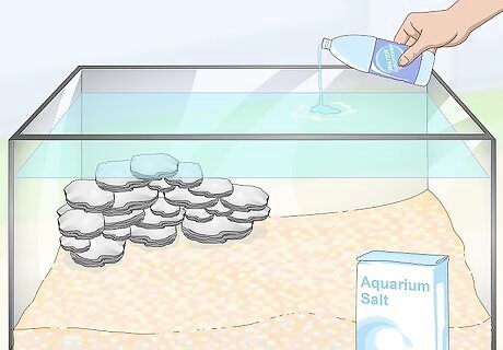 Treat the water with aquarium salt and water conditioner. For every 5 gallons (19 L) of water, you should add 1 tablespoon (about 17 grams) of aquarium salt. Also use a water conditioner specifically for cichlids and add the amount specified on the label for the product. It will remove the chlorine. If you are using aquarium gravel instead of aragonite or coral, you will need to add 1 teaspoon of baking soda per 5 gallons (19 L) of water if you have soft water. You also need to maintain a pH level between 7.5 and 8, which the baking soda will help you do. You will need to measure the pH level in your tank at least once a week and raise the pH level as needed.