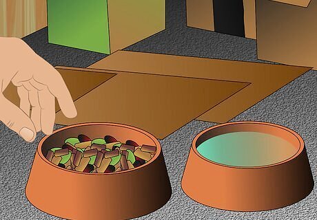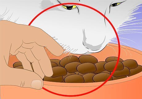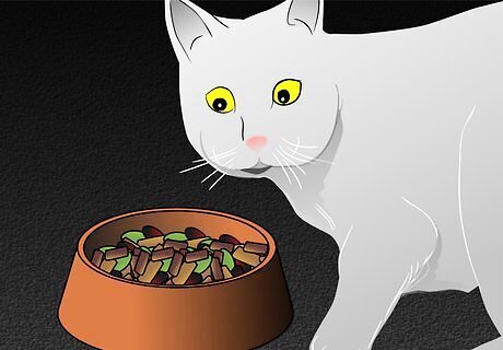 Make sure the cat can easily access food and water from her hiding place. Resources such as food and water are high value assets to a cat. It is likely that in the abusive household these were either withheld or it was too dangerous to seek them out.Therefore, the cat's stress is greatly reduced if she has these resources easily available. If she hides beneath a bed, put a saucer of biscuits near the edge so that she can snack without having to cross an unfamiliar, scary room to get to them.