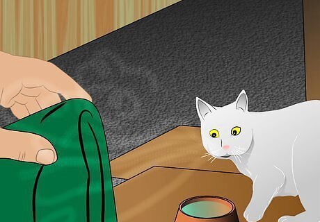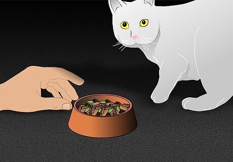 Draw the cat closer to you with a trail of treats. Once the cat takes a treat at a distance, start leaving the treat a little bit closer each time, setting a trail for her to follow that draws her closer to you. Ultimately, the goal is to get her approaching close enough to take a treat from your hand, and eventually allow you to gently pet her. In this way get the cat patterned onto treats, which will help her to associate you with pleasant things.