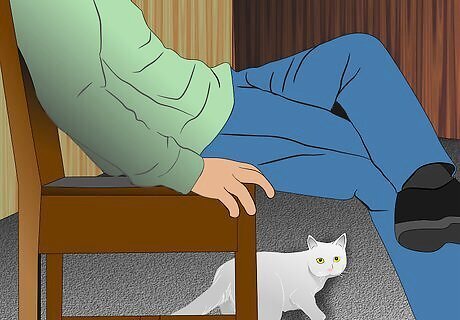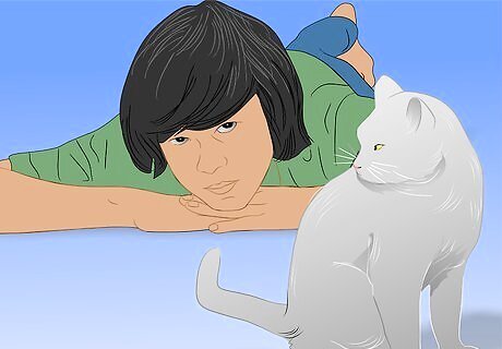 Consider lying on the floor to avoid intimidating the cat. A tip for winning the cat's confidence when she ventures out of hiding is to lie on the floor. When standing up, a human is an imposing sight to a cat. Lying on the floor you look less intimidating, making it feel safer for the cat to approach. Don't forget to keep those treats handy so you can scatter them on the floor as she draws closer. Again, as the cat explores never cut off her escape route in case she need to retrace her steps in a hurry.