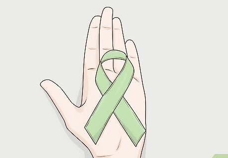 Pass out green ribbons to represent mental health awareness. Green ribbons are the official symbol for mental health awareness. Make your own green ribbons by cutting 6 in (15 cm) strips of ribbon. Create a loop with a strip of ribbon and hold the 2 sides together. Insert a safety pin through the area where the sides cross to secure the ribbon. Continue to make ribbons until you run out of ribbon or have enough for your coworkers. The side of the ribbon where the safety pin is visible will be the back of it. People can use the safety pin that secures the ribbon to fasten the ribbon to their shirts.