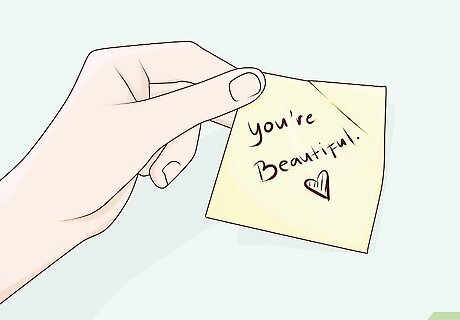 Post inspirational quotes around your workplace. Quotes can change someone’s outlook and help them feel more positive. Plus, they may actually boost worker productivity when they’re posted around the workplace. Write your favorite inspirational quotes on sticky notes or index cards, then hang them up in the bathroom, the break room, the hallways, and your coworkers’ offices. You might post comments like “You’re beautiful,” “You deserve happiness,” and “You’re perfect as you are” on the bathroom mirror. Put notes that say things like “You can do it,” “You’re amazing,” or “I believe in you” on your coworkers’ desks. Post comments like “Everyone is a star,” “You are loved,” and “Just keep swimming” in the hallways or break room.Tip: If it’s okay with the owner or supervisor, encourage your coworkers or employees to post their own encouraging comments around the workplace. They can post their comments in the bathroom, along the hallways, or on each others' doors.