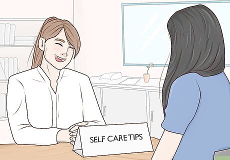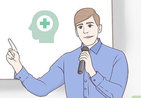 Invite a guest speaker to talk about mental health if you’re the boss. A guest speaker is a great way to educate your employees about mental health issues and why they matter in the workplace. Consider inviting a motivational speaker, health educator, or psychology professor to come talk to your employees. Ask the speaker to focus on raising awareness or teaching employees how they can improve their mental health. You may be able to find a good guest speaker by contacting a local college or university, a clinic, or a nonprofit organization.