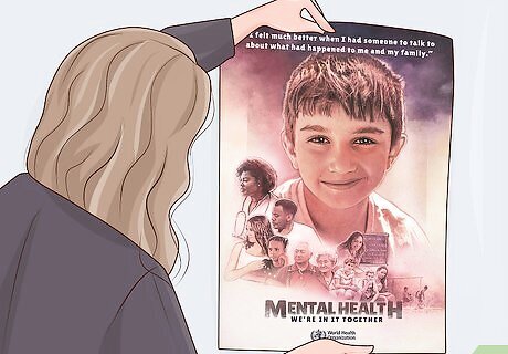 Hang World Mental Health Day posters around the office. Download and print out World Health Day posters from the WHO website or create your own. Then, post them in the halls or break room in your workplace. If you can, put a poster on the entrance door so everyone sees it. If you want to make your own posters, you could use poster board and art supplies, like markers or paint. Alternatively, you might create a poster in a design app if you have graphic design or digital art skills.