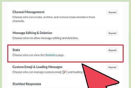 Change stat page access permissions. Click “Stats” to expand. A dropdown menu will appear allowing you to restrict access to the https://[teamname].slack.com/admin/stats page to only team Admin and Owner roles.