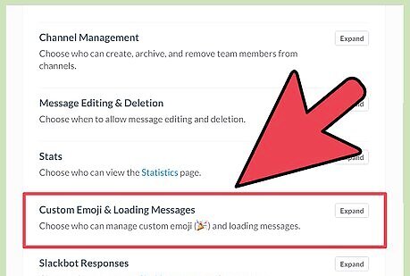Change emoji permissions. Click “Custom Emoji & Loading Messages” to expand. Dropdown menus will appear allowing you to restrict the upload of custom emoji and loading messages to only Admin and Owner roles. This setting only changes upload permissions. Once uploaded any user can utilize the custom emoji or loading message.