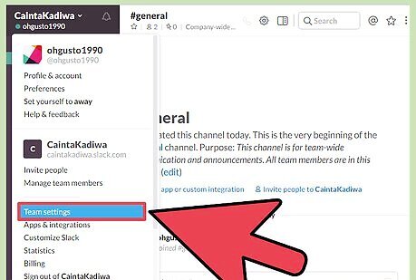 Select “Team Settings”. This will take you to the “Settings and Permissions” page. This option will only appear if you are a team admin. You can also access this page by going to https://[teamname].slack.com/admin/settings in your web browser.