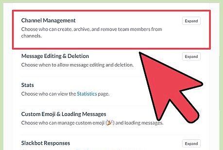 Change channel management permissions. Click “Channel Management” to expand. Dropdown menus will appear allowing you to choose which member roles can create and archive public and private channels as well as who has permissions to remove other members from channels.