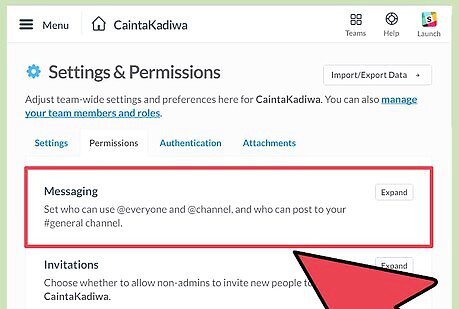 Change messaging permissions. Click “Messaging” to expand. Dropdown menus will appear allowing you to choose which member roles can use the “@everyone” and “@channel” messaging commands as well as who can post in the #general channel.