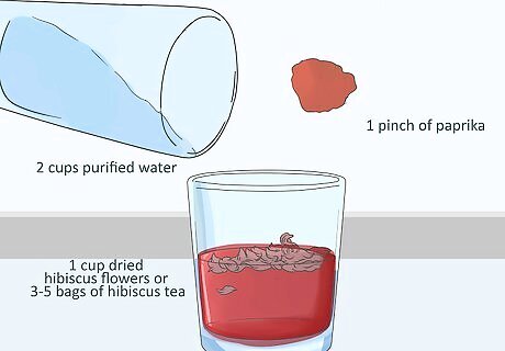 Add the hibiscus tea bags or dried hibiscus flowers to the water. Allow the tea to steep for approximately 5-10 minutes. Keep in mind that the longer you steep the hibiscus, the stronger the solution will be. After steeping, strain the hibiscus flowers or tea bags out of the water. If you are using the optional paprika, add a pinch of it to the hibiscus water after straining and stir it well.