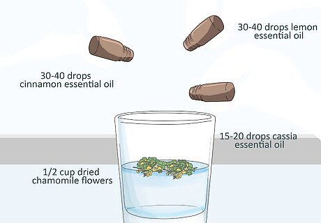 Gather the materials. This lightening spray calls for dried chamomile flowers, lemon essential oil, cinnamon essential oil, and cassia essential oil. You will also need a large mixing bowl and a spray bottle made of dark glass that will hold approximately 1.5 cups (12 fluid ounces) of liquid. Having a funnel on hand will also be helpful. The exact recipe is: 1/2 cup dried chamomile flowers; 30-40 drops cinnamon essential oil; 30-40 drops lemon essential oil; 15-20 drops cassia essential oil.