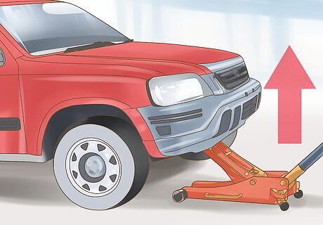 Hoist or jack up your car. There are many ways you can jack up/hoist your car. The three most common ways to hoist/jack up your car is with a two-post hoist, hydraulic floor jack, and ramps. If you are using the two-post hoist, you can drive your car in between the two posts and then position the hoist legs onto the pinch welds of your vehicle or the designated hoisting points. (You can find the designated hoisting points in your owner's manual). Make sure the car is in neutral in case you need to move it back or forward to get the hoist legs positioned properly. If you are not fortunate to have a two-post jack, you are not out of luck. You can use a hydraulic floor jack or ramps. When jacking up your car with a hydraulic floor jack, you will position the hydraulic floor jack directly under the pinch welds. CAUTION: ALWAYS USE SAFETY STANDS when lifting your vehicle with a hydraulic floor jack so it doesn't slip of the pinch welds. When using ramps, just drive your vehicle up the ramps and make sure your put it in park and place a piece of wood or metal pipe behind the rear wheels so it doesn't roll.