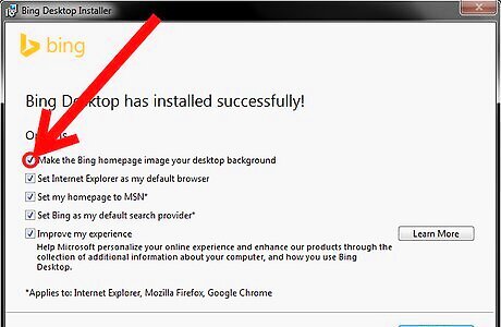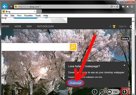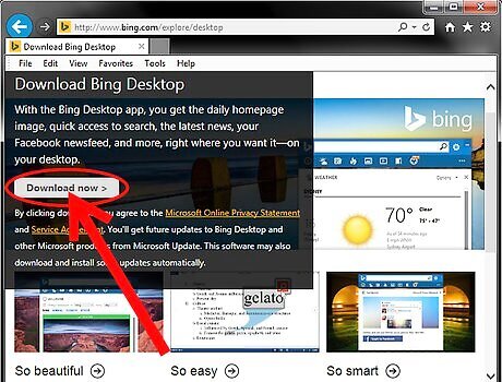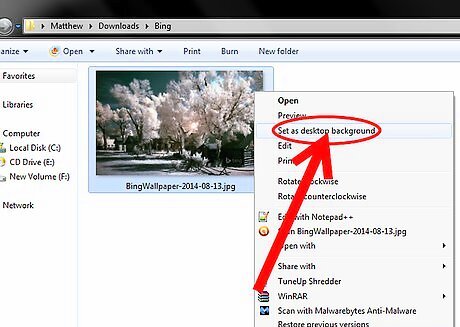 Download the Bing Daily Image to Your PC. Make sure to download each new image each day you sign on. Only use the manual download link to the file (not the one from Bing Desktop version that was given) to download the file. Bing Desktop will help change this wallpaper every day automatically. Realize that this will change each day, upon the very first sign-in on your computer. It will change if you've either shut it down all the way, or you've hibernated the computer, or even if you've put the computer in sleep mode. This won't happen just because it's been 24 hours. If the picture hasn't changed and it's been 25 hours or more, quit the Bing Desktop software and restart it manually. It should reset itself again and open the newest image possible.