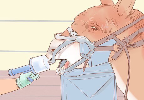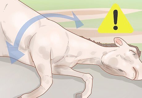Notice signs of colic, such as your animal pawing or nipping at its stomach. Dental problems often cause colic in equines. If your animal has colic, it may chew at its stomach, keep looking back at its stomach, roll around on the ground, or show other signs of distress. It may also stop drinking and passing feces. Colic can be very serious for equine, so if you suspect your animal has it, you should call the vet to come see it while you check on it every 15 to 20 minutes. While you wait for the vet to get there, you can walk your animal at a gentle pace. Don't give it any food or water, as that could make the situation worse.