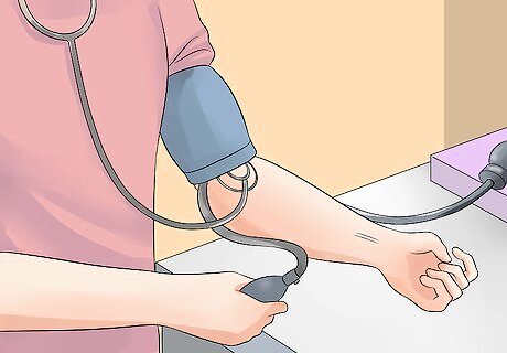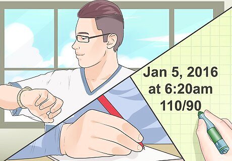 Wear a wrist monitor. Purchase a wrist blood pressure cuff and read the instructions carefully. Strap the cuff onto your wrist and turn the machine on. Press the button that initiates the reading and wait for it to inflate. Keep your arm level on a table in front of you while the wrist monitor is working. When the process is over, the cuff will automatically deflate and the reading will flash on the screen. You should be able to purchase a wrist monitor relatively inexpensively at your local pharmacy store.