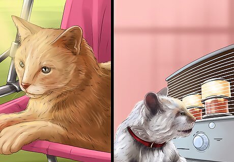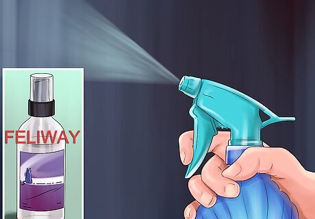 Try a pheromone spray. Ask your vet about pheromone sprays as a way to relax your cat. These sprays contain a synthetic version of a smell that cats use to bond with each other and loved ones by rubbing up against them. For instance, Feliway, a synthetic copy of cats’ facial pheromones, is available through many veterinarians.