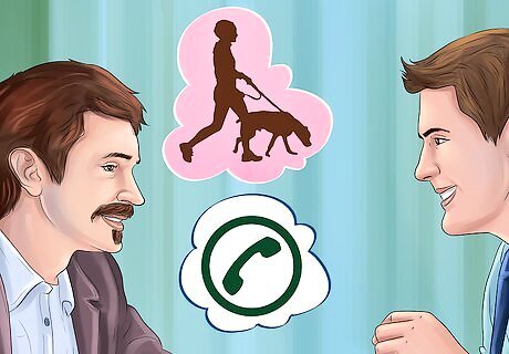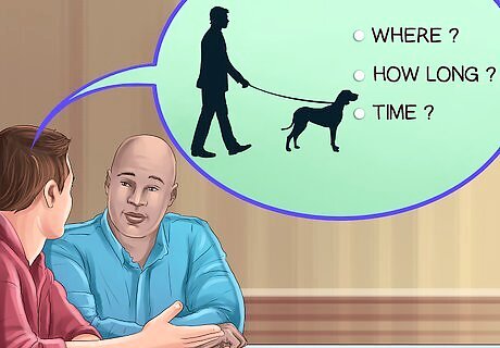 Set up an interview time. Many dog-walking services offer a free initial meeting and consultation. During this time, you can see how the dog walker interacts with your pet and whether you have a good rapport with them. This is a good opportunity to assess whether the interviewee shows up on time and behaves in a professional manner. After all, you will be entering into a business relationship with them. Ask if they will accompany you on a trial walk. This will allow you to show them how you walk your dog, and you'll be able to watch how they handle the dog.