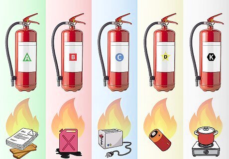 Decide what classes of fires may be encountered in that location and choose the correct types of extinguisher. In the United States, there are 5 classifications. A - Ordinary combustibles such as paper and wood. B - Flammable liquids and fumes such as gasoline and molten plastics. C - Electrical fires which includes any energized electrical objects. D - Combustible metals such as magnesium wheels or lithium batteries. K - Deep oils and greases found in a kitchen fire. Note that fire classifications outside the USA may use their own designations and that extinguisher type-markings may not always reflect the US standards with which you are familiar.