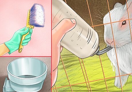 Put a water bottle or crock in his cage. Rabbits need water on a regular basis, so you need to have water available to them all the time. Choose either a crock or water bottle for your rabbit. Some rabbits prefer one or the other, but either one should work well for your rabbit. Crocks are small ceramic bowls that you can put water in. Choose a crock that's sturdy and won't tip over. Cleaning crocks can sometimes be a pain. Since the crock sits on the floor of the cage, it can get dirty. Make sure to clean your rabbit's crock regularly. Throw out any crocks that have chips or cracks, since they can potentially injure rabbits if they ingest chips from the broken crock. Water bottles are another option for your rabbit's cage. They are usually suspended from your rabbit's cage, so you can avoid much of the cleaning involved with crocks. Suspended water bottles usually need to be refilled about once a day. Inspect the bottle carefully when you refill it to make sure there are no leaks.