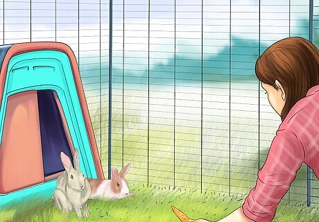 Interact with your rabbit on a daily basis. Rabbits need plenty of attention, especially if they are living outdoors in a cage. Make sure to pet or play with the rabbit every day if she lives outside. Don't pick up the rabbit abruptly. Since they are prey animals, rabbits may think you are a predator and become frightened. Sit on the ground and wait for your rabbit to come to you. Your rabbit may like being petted, but not picked up. Give your rabbit plenty of exercise outside of the cage. Rabbits need 20–40 hours of exercise per week. They like to explore, so make sure to keep an eye on your rabbit when she is exploring. If you do pick up your rabbit, place one hand under her rib cage and another under her bottom, so the rabbit can't kick. This will protect you from her powerful legs and nails. It will also make sure your rabbit is adequately supported.