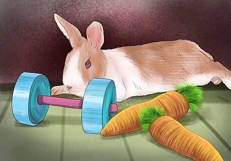 Make sure your rabbit has plenty of toys. Rabbits are playful creatures who like to chew, toss, dig, and explore. Provide your rabbit with stimulating toys so she will not get bored while she is in a cage. Supervise your rabbit when she is playing. Any toy can be dangerous, so make sure your rabbit does not get hurt. Rabbits like to chew, so cardboard, wicker, and hay are fun for rabbits. Be careful that they do not have any chemicals such as varnish on them when you give them to your rabbit. Find toys that you can toss around the cage. Rabbits are interested in movement and like to explore things that move. Look for toys that dispense food. This will encourage rabbits to keep playing with fun toys that give her something to eat. Old towels can also be a fun toy for rabbits. Observe the rabbit to make sure she does not eat towels or any of the above toys. Toys bring you and your rabbit closer together. Having playtime with toys will form a closer bond with your rabbit.