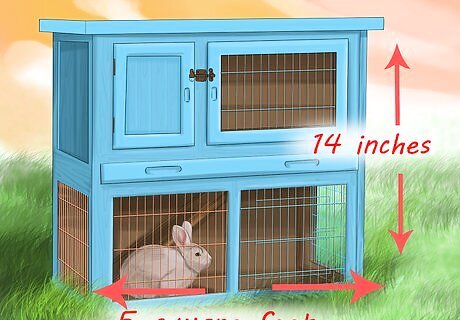 Find the right size cage. Different sized rabbits need different sized cages. Make sure the cage you choose is spacious enough for your particular rabbit. Cages should be at least fourteen inches in height or enough height so the rabbit is able to sit upright without banging her head. Have roughly five square feet of space in the cage for your rabbit. For smaller rabbits, you may need less, but they should have plenty of space to run around. Provide enough extra space for your rabbit's toys, litter box, food, and water. These should not count towards the five square feet of space needed for your rabbit to run around.