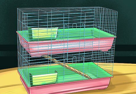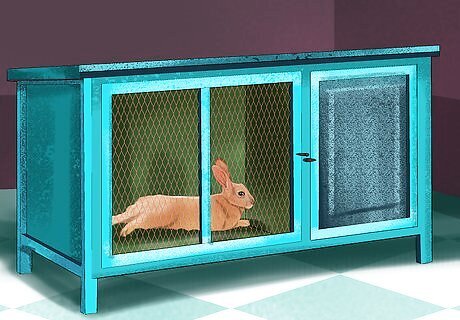 Get an indoor rabbit cage. Indoor rabbit cages can often be restrictive for your rabbit. Make sure you have enough space in the cage for your rabbit. You should also be able to leave the cage open so he can get plenty of exercise. Give your rabbit enough space in his cage. There needs to be enough room for him to move around in the cage and lie down. The minimum size is three hops long and two hops wide. Of course, the bigger the cage, the better it will be for your rabbit. Make sure your rabbit has space for food, water, a litter box, and toys. He will need things to do and to eat and drink in his cage. Try a cage with a front door for your rabbit. Purchase a cage that opens either from the inside and/or outside. Cages with doors that open out enable your rabbit to come and go when he wants, whereas doors that only push in mean you have to get the rabbit out of the cage yourself. Make sure your cage has protection for the rabbit's feet. Cage flooring can injure the rabbit's feet, so provide soft material that can cover the cage flooring, such as an old blanket or towel.