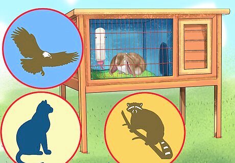 Keep your rabbit safe from predators. Outdoor cages expose your rabbit to potential predators, including cats, dogs, birds, and raccoons. Your outdoor rabbit cage needs to be off the ground and provide your rabbit with somewhere to hide if she gets frightened by predators. Place the rabbit hutch high above the ground. Don't make it so tall that the rabbit gets frightened, but the hutch should be tall enough for the rabbit to feel distance from any potential predators that approach the hutch. Give the rabbit a shelter, such as a small box or travel carrier where she can hide. Rabbits may get frightened if approached by predators, so she will need somewhere to conceal herself. Keep the top of your rabbit's outdoor cage enclosed. Open cages are not good outdoors, since birds, cats, and raccoons can easily get into a cage with an open top.