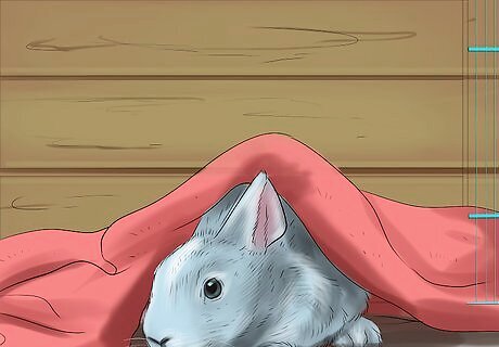 Make sure your rabbit is warm enough outdoors. Rabbits are mammals and need to regulate their body temperature. Give him plenty of shelter outdoors if you choose an outdoor cage. If you live in an especially cold environment, it's probably not a good idea to keep a rabbit outdoors. Provide your rabbit with a warm blanket or rug. Make sure the blanket is thick enough to keep the rabbit warm when the outdoor temperature is very cold. Place a small shelter in your rabbit's cage. It should be concealed from the elements and give the rabbit a way to avoid cold and precipitation. Don't keep a rabbit outdoors if you live in a colder environment. Outdoor rabbits can freeze to death if exposed. Consider keeping the rabbit indoors if it's too cold where you live.