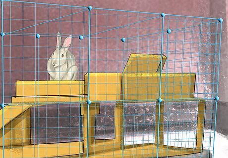 Try a puppy pen for your rabbit. Puppy pens are fences that give your rabbits a wide range to run around. They provide your rabbit space inside and allow him to move around wherever he wishes. A puppy pen can be good to give your rabbit more space. It's more open than a regular cage and less work to make than a bunny condo. Puppy pens are available at most pet stores. They do not usually have a top, but enable your rabbit to roam around inside the pen. Get a puppy pen that is high enough so your rabbit cannot leap over the top. Over 36 inches (91.4 cm) is ideal to keep your rabbit from hopping away. Using a puppy pen can be good if you're trying to get your rabbit used to being in open spaces before giving him free range. This will reduce his stress and make sure he is not overwhelmed by too much space.