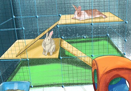 Build a bunny condo. Bunny condos are bigger cages that give your rabbit space to run around. You can make a bunny condo out of a variety of materials, including wood, metal, or old furniture. Think about what potential materials you may have already around the house. You can make a bunny condo from a variety of used materials. Use wire storage cubes, which are available at most retailers. This can be an inexpensive way to build a bunny condo, though it may take some time to complete. Avoid chicken wire, since rabbits can chew the wire. If they chew chicken wire, rabbits can hurt themselves. Keep metal slats close together so your rabbit will not get stuck. She may put her head through and not be able to escape, leading to to injury or possible strangulation.