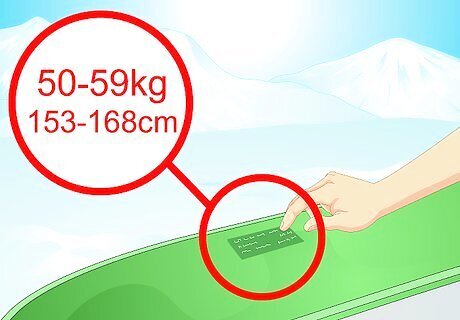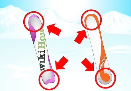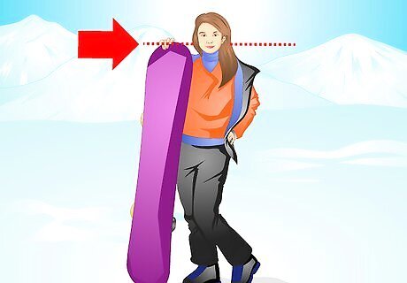 Choose a board size. Snowboards are usually measured from tip to tip in centimeters. Place the tip on the ground and stand the board up to your face -- the top of the board should reach your chin. However, there are a lot of benefits to buying shorter or longer boards. In general, shorter boards are more maneuverable and longer boards are more stable and can go faster. Beginners should choose a board on the longer end -- one that reaches their nose when stood up, for example. Heavier riders should consider slightly longer boards to distribute their weight.
