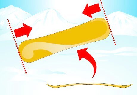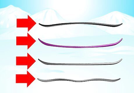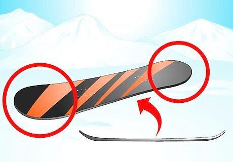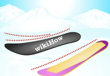 Think about the camber or profile of the board. Once upon a time, all boards came in the same shape. No more. Today, there are a variety of designs for different riders known as camber. This corresponds to the profile of the board, or what parts touch the ground. Consider renting 2-3 types of the board before buying to see what camber you prefer. (Note: Camber refers to the general style of the board (camber type) and a specific style of board.) Different camber types include: Camber Board: The most common board, cambers touch the ground near the tips but curve up in the middle. When you stand on the board you push the center down, but it retains some of the pop for jumps. Rocker: The opposite of camber boards, rockers curve down. This keeps your tips out of the snow, increasing maneuverability. Flat: Exactly what it sounds like, flat boards curve up slightly at the tips but are flat throughout. While flat boards are vulnerable to caught edges in the snow, this shape is the easiest to turn and floats well on fresh powder. Hybrid: Many companies have started to mix and match the camber, rocker, and flat boards, making shapes for any rider. Boards like the "rocker/camber/rocker," for example, can handle a variety of situations and terrains.
