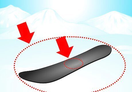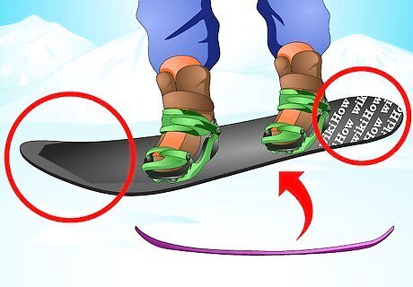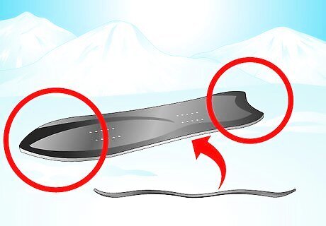 Choose a "powder board" to ride smoothly in fresh snow. Powder boards are usually made for downhill riders who encounter a lot of fresh, soft snow. They have long or tapered noses and raised ends to help them stay on top of the powder. The bindings are generally set towards the back of the board to keep the front end up. Size: Generally longer to increase surface area and speed, since powder boards are not often used for tricks. Directional: Most powder riders prefer directional boards since the design allows them to sail smoothly over fresh snow. Camber Type: Powder boards usually have a rocker shape, which is when the entire board curves slightly upward. This keeps the tip and tail elevated so it doesn't get caught in the deep powder.