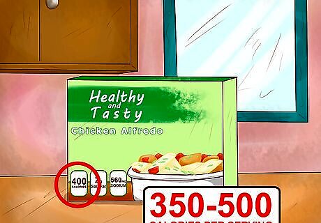 Determine the number of calories in each meal. Companies are required to list the number of calories which make frozen foods good for those that have diets that require them to calculate their daily caloric intake. While it may be tempting to go for the meal with the least amount of calories, it's advisable to stay away from meals that have too little calories. Choose meals between 350 and 500 calories per serving, so that you can get the nutrition you need while maintaining your diet. A meal that contains less than 200 calories won't give you the energy you need and you may be tempted to snack afterward. Low calorie frozen meals can lack fiber and necessary fats that keep you healthy.