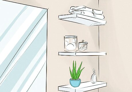 Add some shelving. Most bathrooms do not have an overabundance of space. Because of this, you may want to consider installing some simple selves. You can attach floating selves to your walls or purchase shelving at your local hardware store. This will free up floor space and provide an area where your plants are out of the way. Shelves are a great location to keep plants that need indirect sunlight.