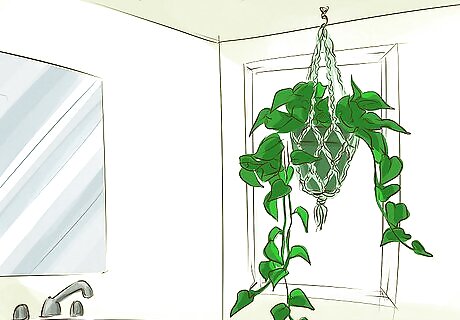 Hang pots from the ceiling. Some of your plants will do well hanging from the ceiling in a pot. Ferns and certain types of ivy will grow beyond the edge of the pot and hang over the side, which is visually appealing. It also opens up floor and shelf space for toiletries and other plants. Make sure that you avoid hanging your plants in an area where you may hit your head on them. You should also attach them securely so they do not fall on anyone.