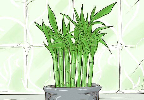 Plant some lucky bamboo. This member of the Dracaena family is not actually bamboo but a distant cousin of the dragon plant. Lucky bamboo often grows in water, which makes it a great choice for a moist bathroom. Simply cover the roots with 1 to 3 inches (2.5 to 7.5 cm) of water and it should start growing. You can also grow lucky bamboo in soil. Lucky bamboo can grow in little to no sunlight.