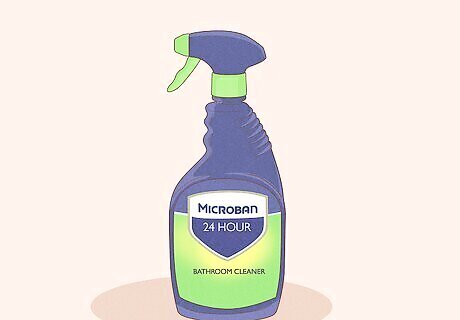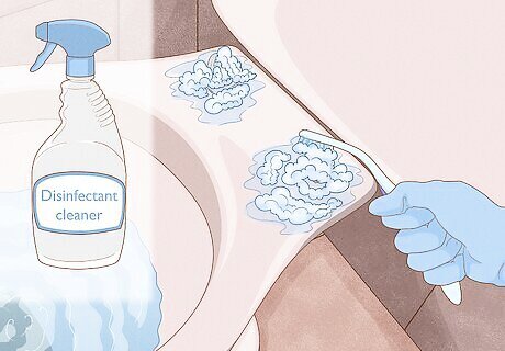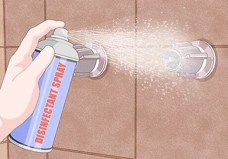 Disinfect high-touch areas. Only disinfect surfaces once you’ve finished cleaning. Apply disinfectant spray to areas that are touched frequently or are especially dirty, like cabinet and faucet handles, door knobs, and the toilet seat and handle. Use disinfecting wipes to wipe anywhere there’s been oversplash on the floor or walls near the toilet.