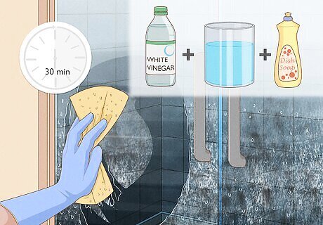 Remove soap scum. Cleaning your bathroom regularly should help prevent soap scum, but if it's built up, make a cleaning solution of distilled white vinegar, warm water, and a squirt of dish soap. Spray or wipe it over glass shower doors or any other surface that has soap scum. Let it sit for about half an hour, then wipe it away. Finish up with a glass cleaner to remove any remaining streaks.