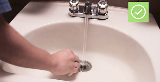 Scrub the sink and counters. Use a small amount of all-purpose cleaner to scrub all the soap scum and toothpaste from your sink and counters, rinsing your sponge thoroughly as you go along. An old toothbrush or cotton swab can be handy for cleaning the gunk out from between the tap and handles of your sink. Now is also the time to clean any countertop items, like soap dispensers, toilet paper holders, and toothbrush holders. Wipe off the fronts and tops of cabinets and drawers, as well, using hot, soapy water. If you’re worried about germs on these surfaces, add a bit of bleach to your soapy water. Clean your counters before your sink, as you may knock dirt and debris into the sink as you work. If your sink is ceramic, cleaning expert Susan Stocker suggests using baking soda to clean it: “Make sure you get it mixed with enough water to make a paste or it’s not going to work—it requires the power of scrubbing just as much as it requires the power of baking soda. [Baking soda] has just the right amount of abrasive power to lift and remove dirt and grease, but it is not going to remove stubborn stains.”