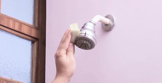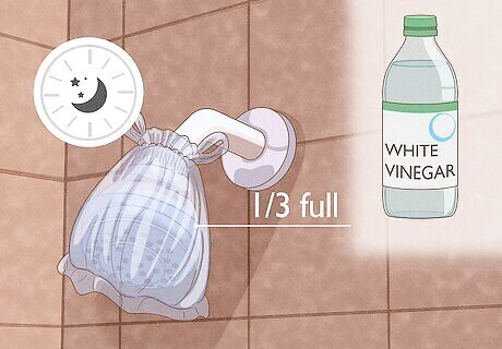 Descale your showerhead. If it seems like your showerhead is clogged, it’s probably time to descale it with vinegar. Fill a plastic bag about a third of the way full with distilled white vinegar and water. Use rubber bands to attach it to your showerhead so it's submerged in the vinegar and let it sit overnight. The next day, remove the bag, scrub the water holes with an old toothbrush to remove any remaining build-up, then run water through the showerhead. Alternatively, remove your showerhead and soak it in a bowl of vinegar overnight.