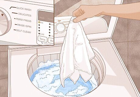 Launder towels, washcloths, and rugs. Gather any dirty towels, washcloths, and machine-washable bathmats, and launder them according to their care label; usually, towels should be washed on a cold, delicate cycle to keep them nice and fluffy. This way, they’ll be washed while you’re working on the bathroom, so they’ll be nice and clean when you get done. Wipe down in-tub bathmats with some soap and water and set them aside to air dry while you work.